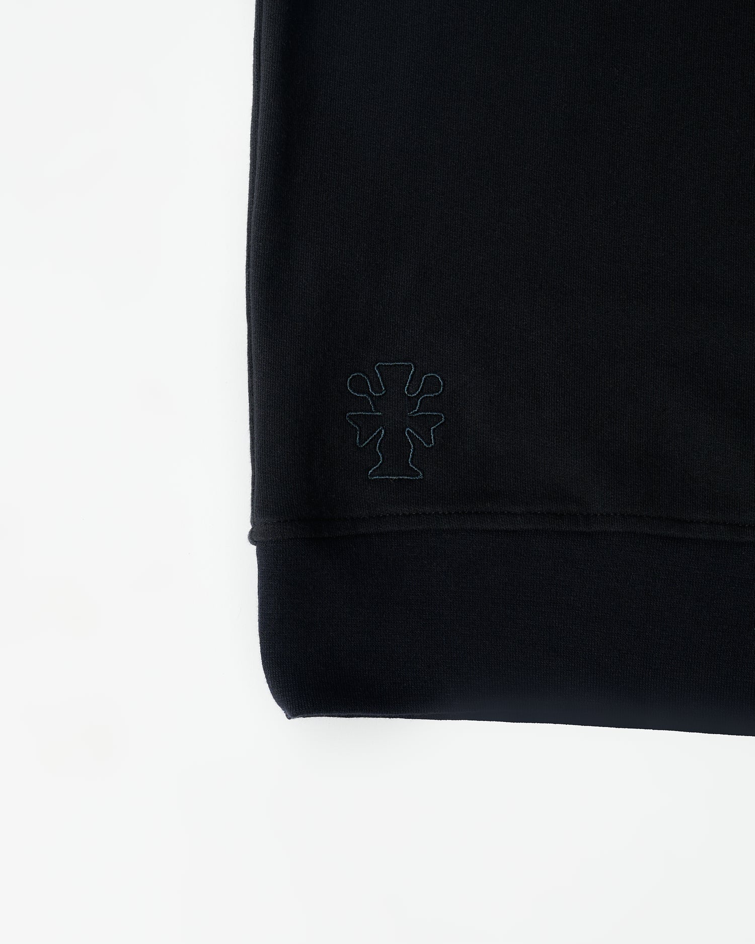 The sweater is finished off with an outline tonal embroidery of our FIELDS totem on the bottom right side hem.