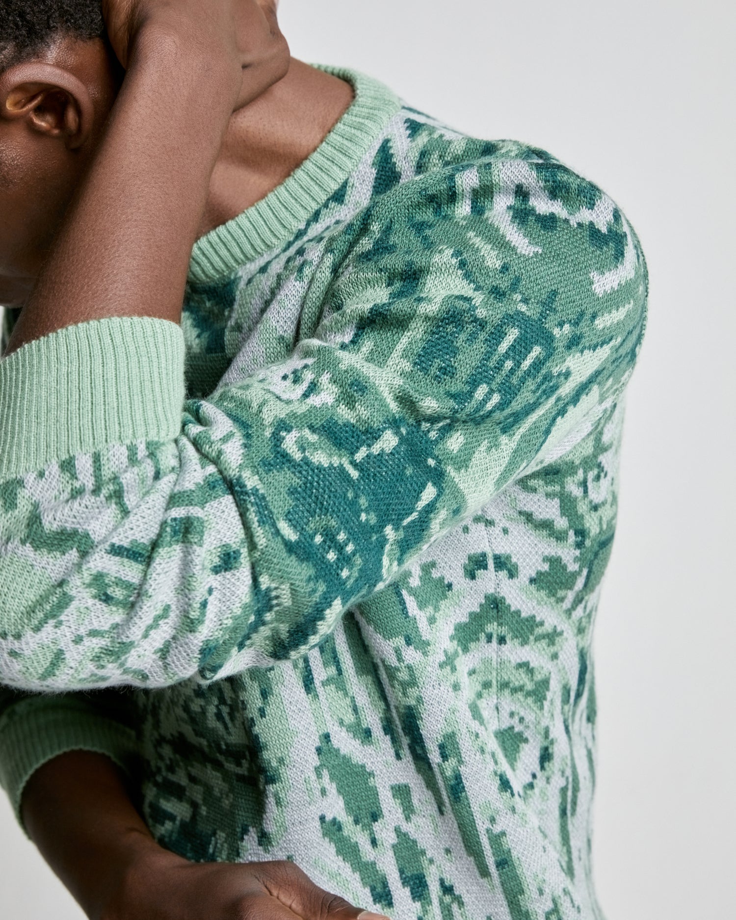 The Artist Collaboration Sweater falls under our 'Art' line which embodies our belief that your work is what you give to the world. This soft, mid-weight, round-neck sweater is knitted in a Merino wool and kid Mohair blend yarn.