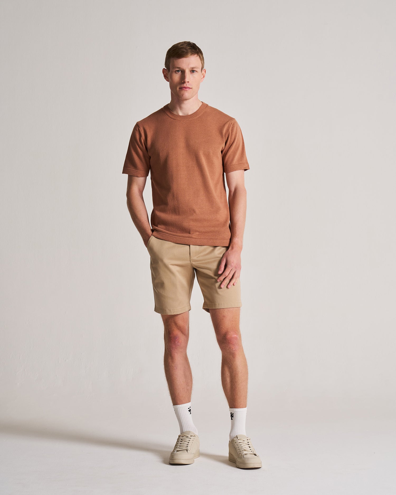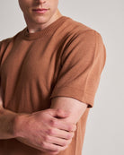 Designed to elevate and bring an interesting texture to a silhouette we all love wearing. A decadently soft, mid-weight 12 gauge fully fashioned knitted tee, made from 100% cotton. It features a ribbed neck, mock back yoke detail, and twin stitching at the shoulder and hem.