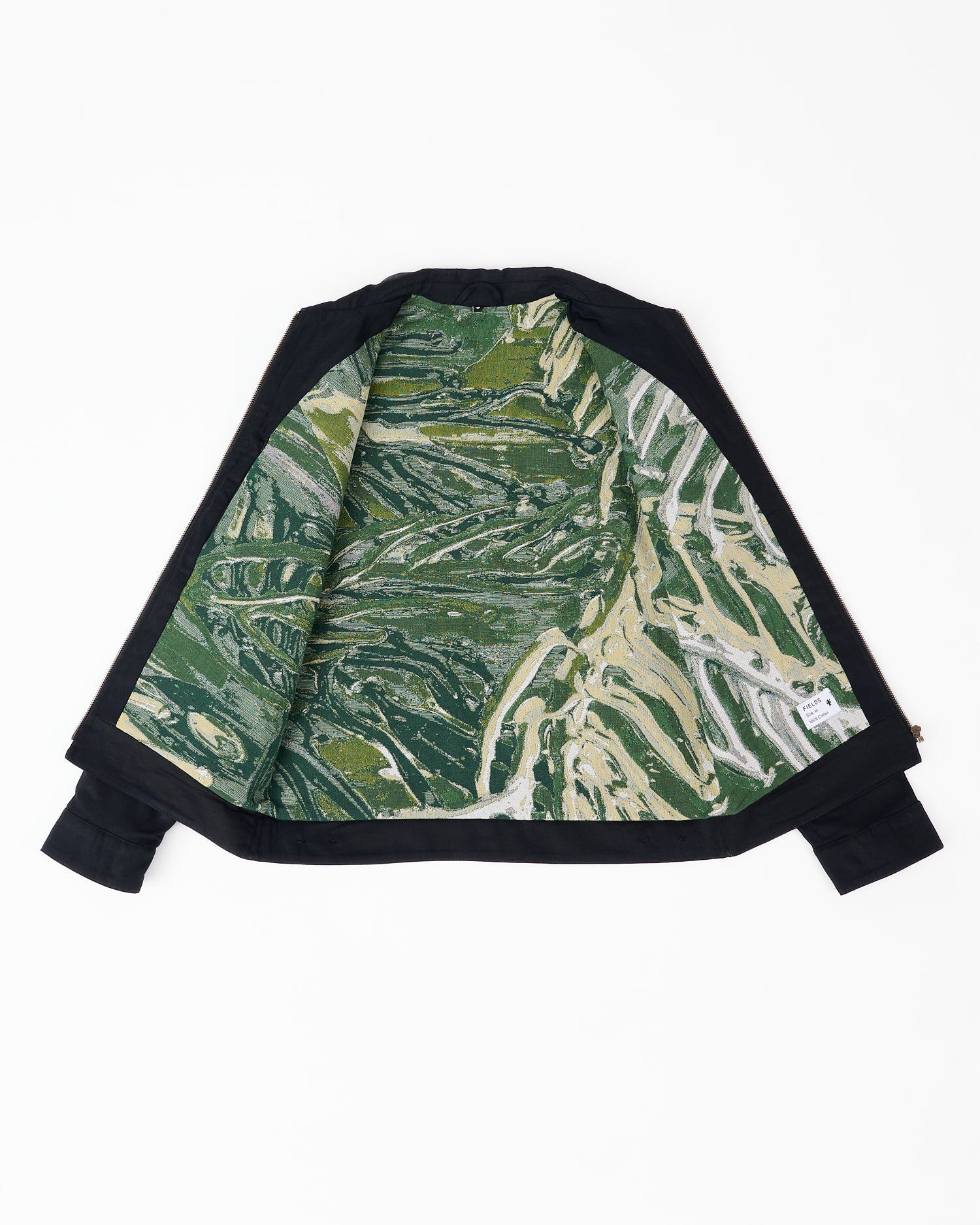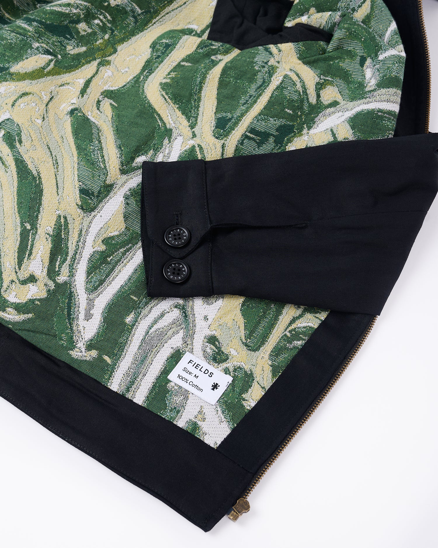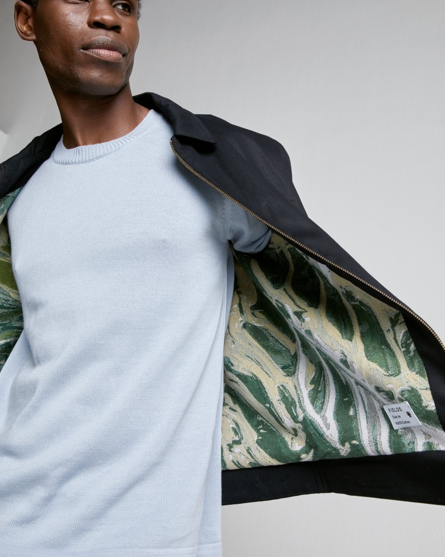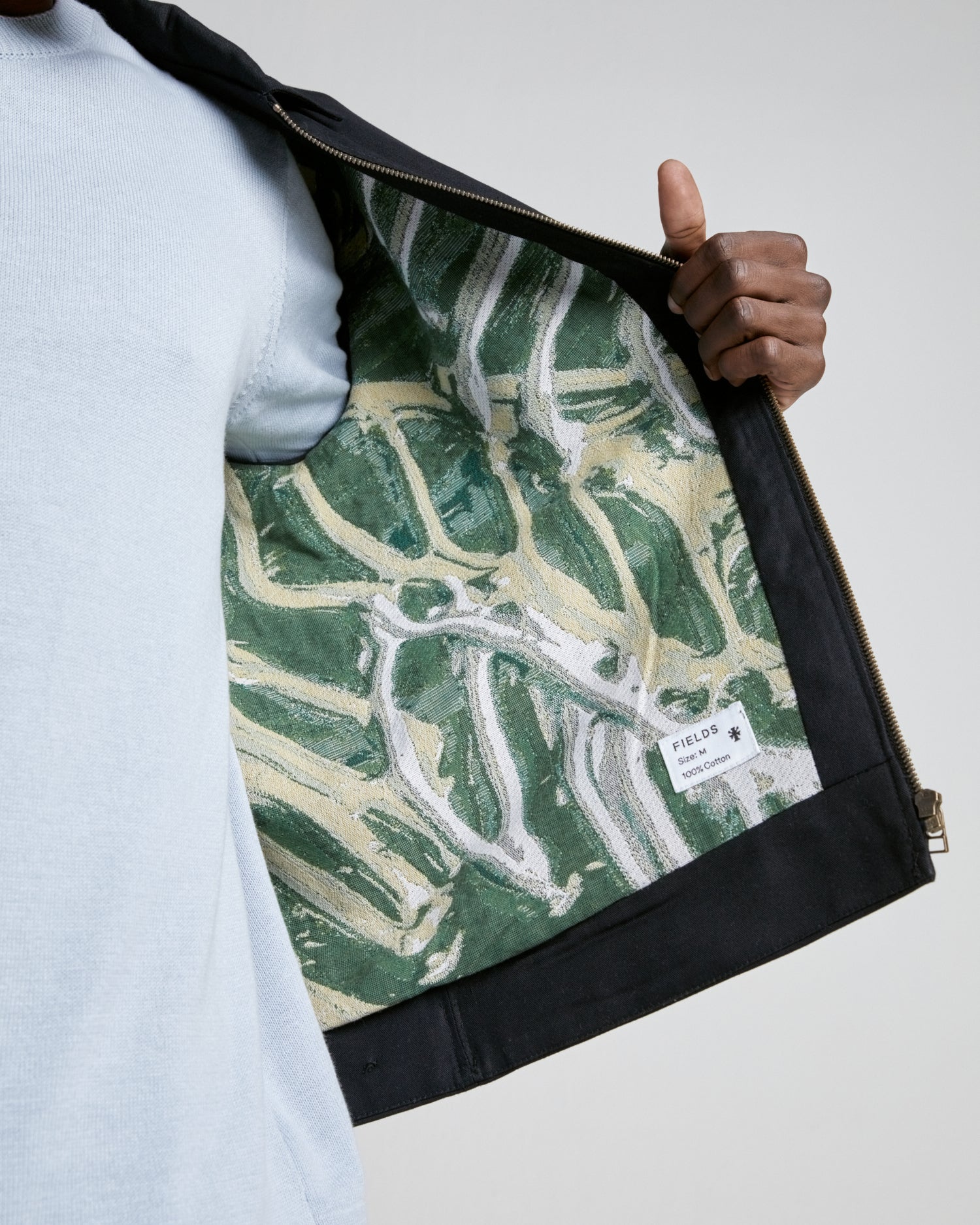 This Harrington style jacket has a tailored cut and is constructed in a heavyweight combed cotton twill. It features front angled welt pockets, a single inner breast (secret) pocket, and adjustment tabs on the sleeves and waistband to ensure a perfect fit. The lining's 100% cotton jacquard weave design is a translation of an artwork created by Gabrielle Kruger for FIELDS.